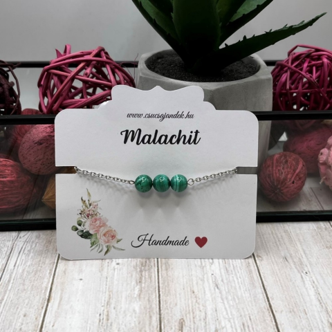Malachit 8mm-es ásványból készült karkötő A lánc és a lánchosszabbító nemesacélból készült a többi alkatrész nikkelmentes fémötvözet. A lánc hossza állítható
