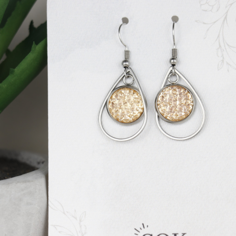 Nemesacél alapból készített druzy fülbevaló. Teljes hossz 4,5cm