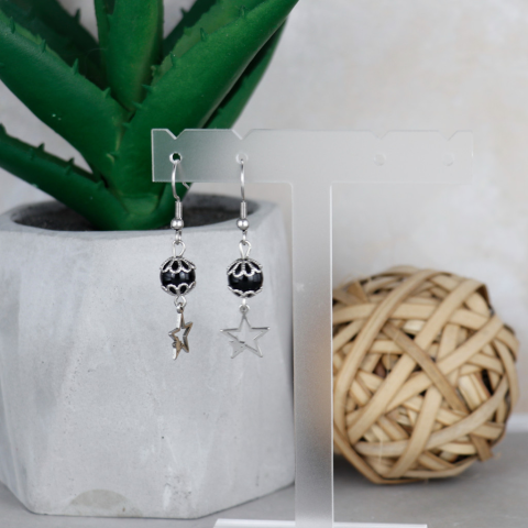 Ónix 8mm-es ásványból készült fülbevaló, ezüst színű csillaggal és gyöngykupakkal. A fülbe akasztható rész nemesacélból készült. Méret: 4cm Ónix: Az ónixot támogató, erőt adó kőnek tartják. Gyakran ajánlják a negatív érzelmek ( Félelem, indulatosság, szom