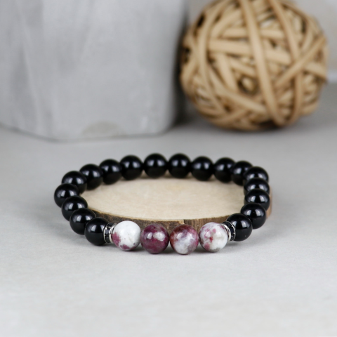 A karkötőn lévő gyöngyök 8mm valódi ásványok, rugalmas szilikonra fűzve, fekete köves köztes dísszel. Több méretben rendelhető. Turmalin kvarc: Egyesíti az ellentéteket. Segít megoldani a lelki tusákat és konfliktusokat valamint hatékony problémamegoldó.