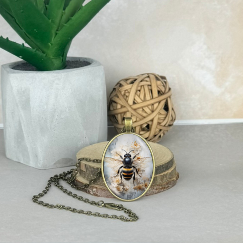 Üveglencsés medál, lánccal-méhecske Medál: 3cm x 4 cm (bronz alap) Lánc hossza:45cm (bronz)