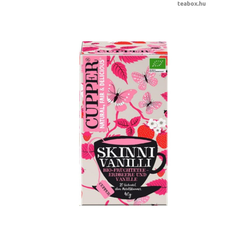 CUPPER Skinni Vanilli bio tea - 20 db teafilter. Rooibos tea eperrel és vaníliával, mely kirobbanó ízeivel napfényt varázsol mindenki lelkébe. Koffeinmentes! Termékleírás Összetevők hibiszkusz*, csipkebogyó*, rooibos*, édesgyökér*, természetes eperarom