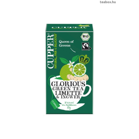 CUPPER Zöld bio tea Gömbér & Lime - 20 db teafilter. Antioxidáns hatású Zöld tea Gyömbér & Lime. Termékleírás Összetevők zöld tea* (70%), gyömbér gyökér*( 20%), limehéj* (5%), természetes lime ízesítés* (5%). *Összetevők: Ellenőrzött ökológiai gazdálko