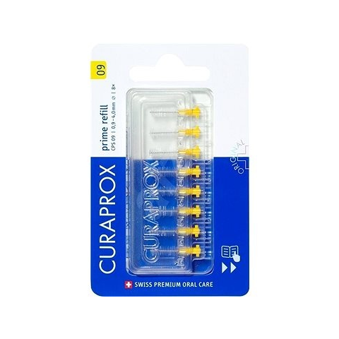 Fogköztisztító kefe - pótfej cserélhető fej, sárga kivitel, 8 darabos csomag A CURAPROX CPS 09 Prime Refill egy rendkívül puha és gyengéd, mégis igazán hatékony és erős csere fogközi kefe, amely ideális a 0,9 - 4,0 mm-es fogközi területekre, így bátran használhatod amikor nagy