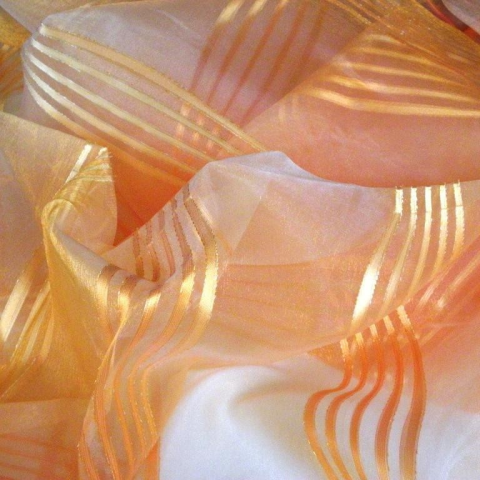 Fényáteresztő függöny méteráru. Magasság: 300 cm. Legkisebb rendelési mennyiség 1 méter. 300 cm magas, narancs színű, organza függönyanyag, beszőtt enyhén hullámos, selyemfényű naracs csíkozással. Ólomzsinóros. Összetétel: 100% poliészter. Felhasználá