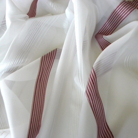 Fényáteresztő függöny méteráru, magasság: 180 cm. Legkisebb rendelhető mennyiség 1 méter. CSILLA, 180 cm magas, krémfehér voile függöny anyag, elegáns, selyemfényű csíkokkal, a színes csíkok közt alapszínében csíkozott mintával. Ólomzsinóros. Összetét