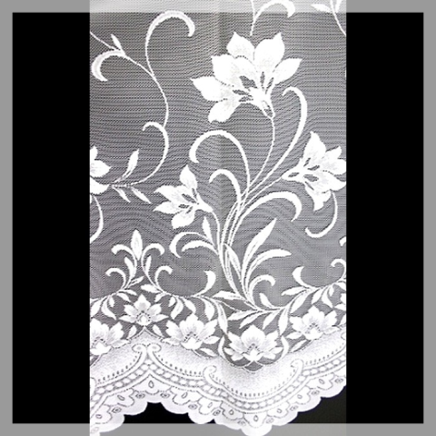 Virágmintás, bordűrös jacquard csipke függönyanyag, 285 cm magas. Maradék mennyiség: 1,3 méter. 285 cm magas jacquard csipke függönyanyag, alján íves kidolgozással, a bordűrben nagy virágokkal, feljebb teljes felületen elszórt virág mintával. (nem kell