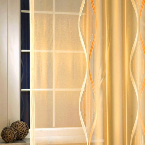 Fényáteresztő függöny méteráru. Magasság: 300 cm Maradék mennyiség 1,2 méter. JAFFA, 300 cm magas, napsütötte narancs színű félorganza, fényes, beszőtt, nyírt hullámmintával. Ólomzsinóros. Összetétel: 100% poliészter. Felhasználási javaslat: fényáteres