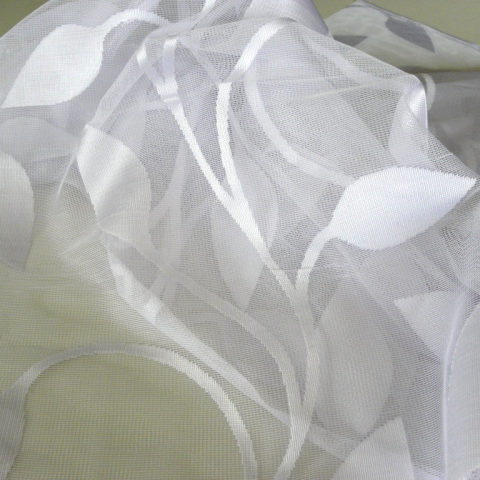 Fehér jacquard csipke függöny anyag. Könnyed levél mintával. 290 cm magas Legkisebb rendelhető mennyiség 1,00 méter. 290 cm magas jacquard csipke függönyanyag, teljes felületen modern könnyed, levél mintával. (nem kell vasalni!) Összetétel: 100% Polié