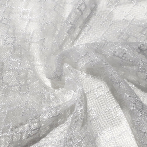 330 cm extra magas modern, fiatalos jacquard csipke függöny anyag, fehér színben. Legkisebb rendelési mennyiség 1 méter. 330 cm magas jacquard függönyanyag, egyszerű rácsmintával. Bármilyen enteriőrbe illik, modern, fiatalos minta, alkalmas közület