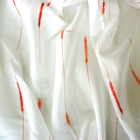 Fényáteresztő függöny méteráru. 140 cm magas. Legkisebb rendelhető mennyiség 1 méter. 140 cm magas fehér voile függöny anyag, modern narancs beszőtt, nyírt csíkmintával. Összetétel: 100% poliészter. Felhasználási terület: fényáteresztő függöny, konyhai