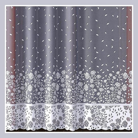 Fényáteresztő, bordűrös, virág mintás jacquard függöny méteráru. Maradék darabok. A méret a lenyíló ablakban választható ki. Fehér jacquard függönyanyag, bordűrös, virágos mintával. Nem kell vasalni! Összetétel: 100% poliészter. Felhasználás: fényáter