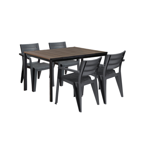 Amari 4+1 kerti bútor garnitúra szett – dió-grafit-Esztétikus, stílusos megjelenés Szett tartalma: 1 db Porto 160 kerti asztal + 4 db Julie kartámaszos műanyag kerti szék Asztal mérete: 159 × 95 × 75 cm Szék mérete: 79 × 61 × 44,2 cm Színek: Asztal –
