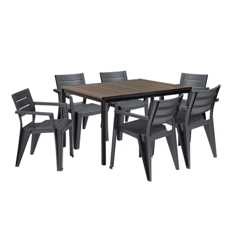 Amari 6+1 kerti bútor garnitúra szett – dió-grafit-Esztétikus, stílusos megjelenés Szett tartalma: 1 db Porto 160 kerti asztal + 6 db Julie kartámaszos műanyag kerti szék Asztal mérete: 159 × 95 × 75 cm Szék mérete: 79 × 61 × 44,2 cm Színek: Asztal –