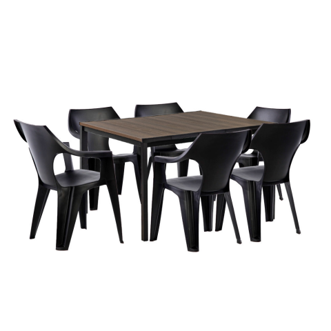 Carter 6+1 kerti bútor garnitúra szett dió-grafi- Stílus és elegancia Ülőhelyek száma: 6 főAsztal mérete: 159 × 95 × 75 cmSzék mérete: 57 × 57 × 79 cmSzék súlya: 2,29 kgAnyag: időtálló polipropilén (szék), DecoCoat™ műanyag + fém váz (asztal)Színkombi
