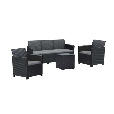 Claire IV 5 személyes kerti bútor garnitúra: Kényelem és stílus a szabadban ☀️ Ez a gyönyörű, grafit színű kerti bútor garnitúra tökéletes választás a kényelmes és stílusos kültéri kikapcsolódáshoz. Időjárásálló, UV-álló műanyagból készült, rattan hat...