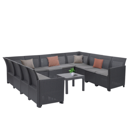 Claire XIII 11 személyes sarokgarnitúra orlando asztallalAzonnal átalakítja a kerted – ülőhely 11 főre, stílusbanA Claire XIII 11 személyes sarokgarnitúra orlando asztallal egy prémium minőségű, variálható ülőbútor, amit te alakítasz a saját igényeid