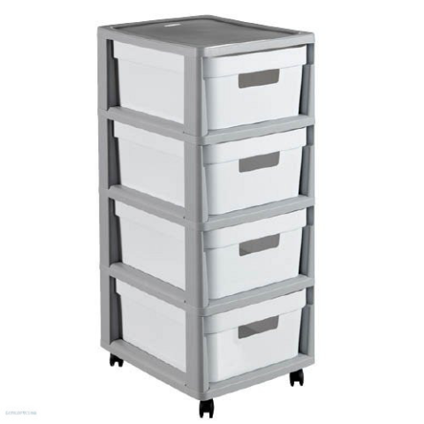 CURVER “INFINITY” fiókos tároló 4x11 literes. Otthoni kellékek egyszerű rendbetételére. Legyen végre minden apróságnak valami helye! A szekrény négy nagy méretű fiókból áll, amelyeknek kényelmes fogókája van. Egyszerű, skandináv stílusának köszönhetően