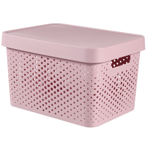 Rózsaszín doboz, igényes kivitelben, lyukakkal a falain, 17 l térfogatú, fedéllel, fogantyúval, 100%-ban újrahasznosított műanyagból, súlya 600 g. A Curver rózsaszín Infinity Dots doboz 100%-ban újrahasznosított műanyagból készült. A 17 literes láda pr