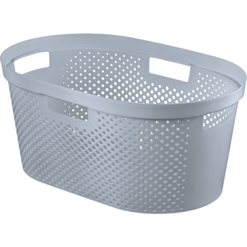 Szürke tisztaruha kosár, űrtartalom 40 liter,4 fogantyú, 100%-ban újrahasznosított műanyag, légáteresztő perforált kivitel. A szürke, 40 literes Curver Infinity Dots tisztaruha kosár 100%-ban újrahasznosított műanyagból készült. A 4 fogantyú ideális a