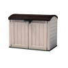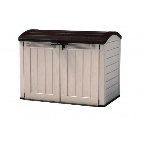 Zárható és magas ellenállású tároló szemetes kukára, kerti szerszámokra és más felszerelésre, 1200 l űrtartalom, lejtő padló kerekes konténerekre, zárható kétszárnyú ajtó, lehetőség polcok beszerelésére. Polipropilén gyanta. Bézs és barna színű. A Kete