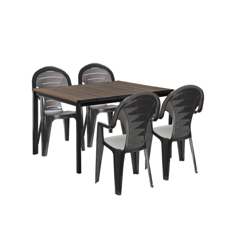 Lagos 4+1 kerti bútor garnitúra dió-grafit-Elegáns és strapabíró kültéri étkezőgarnitúraAsztal (Porto 160):Méret: 159 × 95 × 75 cmAnyag: DecoCoat™ fa hatású, UV-álló műanyag asztallap, fekete fémvázSzín: dió asztallap, fekete vázKapacitás: kényelmesen