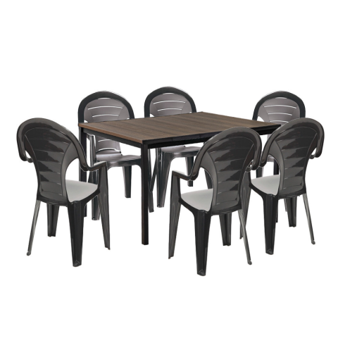 Lagos 6+1 kerti bútor garnitúra dió-grafit-Elegáns és strapabíró kültéri étkezőgarnitúraAsztal (Porto 160):Méret: 159 × 95 × 75 cmAnyag: DecoCoat™ fa hatású, UV-álló műanyag asztallap, fekete fémvázSzín: dió asztallap, fekete vázKapacitás: kényelmesen
