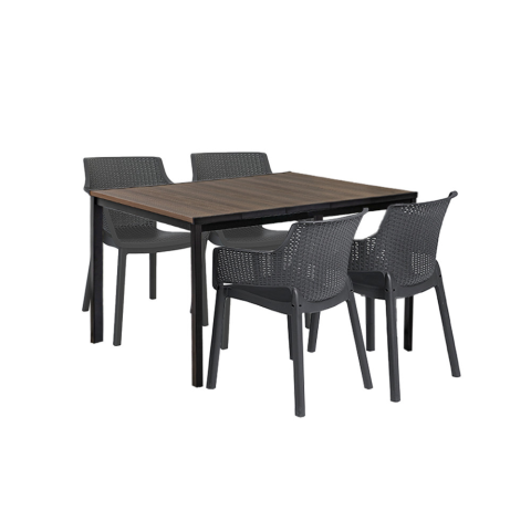 Romen 4+1 kerti bútor garnitúra szett dió-grafit Romen 4+1 kerti bútor garnitúra szett – dió-grafit-Elegáns, stílusos megjlenésSzett tartalma: 1 db Porto 160 kerti asztal + 4 db Eva műanyag kerti székAsztal mérete: 159 × 95 × 75 cmSzék mérete: 79 × 63