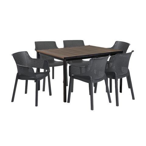 Romen 6+1 kerti bútor garnitúra szett dió-grafit Romen 6+1 kerti bútor garnitúra szett – dió-grafit-Elegáns, stílusos megjlenésSzett tartalma: 1 db Porto 160 kerti asztal + 4 db Eva műanyag kerti székAsztal mérete: 159 × 95 × 75 cmSzék mérete: 79 × 63