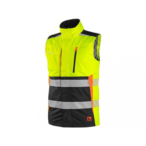 Modern, divatos megjelenésű téli láthatósági mellény sárga-fekete színösszeállításban. A mellényen szegmentált fényvisszaverő csíkok gondoskodnak a láthatóságról.Anyaga víz és szélálló, zsebei cipzárasak, nagy méretűek, jól pakolhatóak.Álló gallérja polár