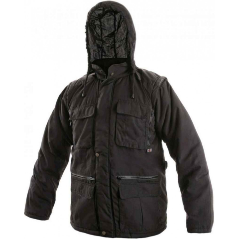 Kapucnis téli munkáskabát fekete színben, levehető kabátujjakkal, fényvisszaverő elemekkel.A kabáton több, mint 7db zseb található, amelyek nagyméretűek, fedettek, jól pakolhatóak. Bélelt 2 az 1 ben kabát levehető kabátujjakkal, gallérba rejthető kapuc