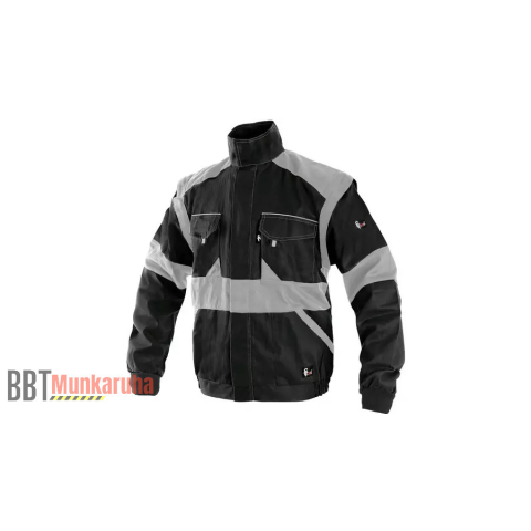 Lecipzározható kabátujjak Füles mellzsebek, oldalzsebek Rejtett cipzáras zseb Gumírozott mandzsetta és derék Reflex kiegészítők 100% pamut, 260 g/m2 Elérhető rövidített (170-176 cm) változatban kék/fekete színben EN ISO 13688