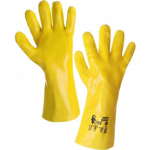 Tekplast vegyszerálló védőkesztyű Teljesen PVC-be mártva Pamut belső Ellenáll olyan anyagoknak mint pl. a metanol, kénsav, nátrium-hidroxid Kesztyű hossza: 35 cm EN 420, EN 388 (3111X), EN 374-1/Type A (AKLMPT) Cat. 3.