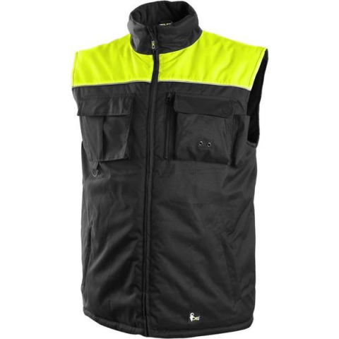Vízálló külső résszel rendelkező téli, bélelt munkamellény kontrasztos színösszeállításokban.Fényvisszaverő szegélyek gondoskodnak a jó láthatóságról.Nagyméretű zsebeinek köszönhetően praktikus viseletet biztosít. Férfi, bélelt vízálló mellény.Magasíto
