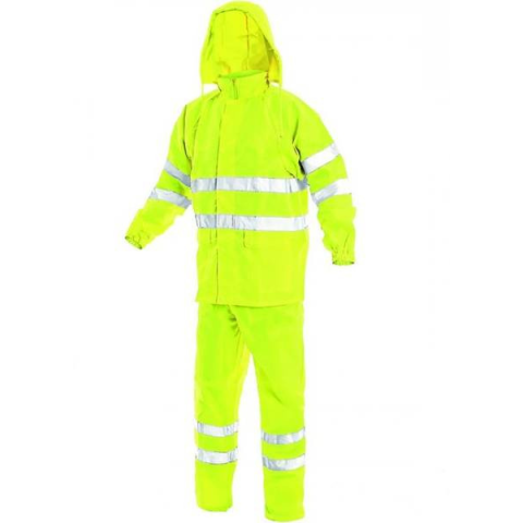 Vízálló, láthatósági esőruha szett, gallérba rejthető kapucnival, vízálló varratokkal, dupla soros széles fényvisszaverő csíkokkal. Vízálló láthatósági esőruha (kabát+nadrág), amelynek kapucnija gallérba rejthető.Kabát része végigcipzáras kivitelű, var