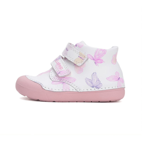 Fehér színű, rózsaszín pillangókkal díszített, 2 tépőzáras, hajlékony talpú, nagy gumi orrú, bőr, DD Step kislány cipő. Talpbetétje kivehető, könnyen tisztítható.