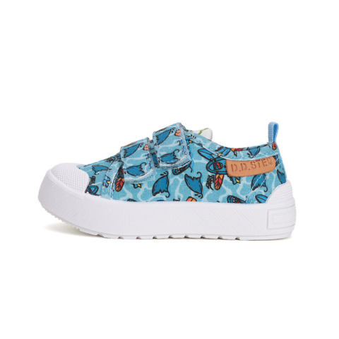DD Step vászon gyerekcipő kék-mintás színben. Benti cipőnek megfelelő választás.Könnyen tisztítható, ideális játszótérre, váltócipőnek, óvodai tornacipőnek. Mosógépben max. 30 C°-on mosható! A mosáshoz a talpbetét kivétele valamint mosózsák használata ja