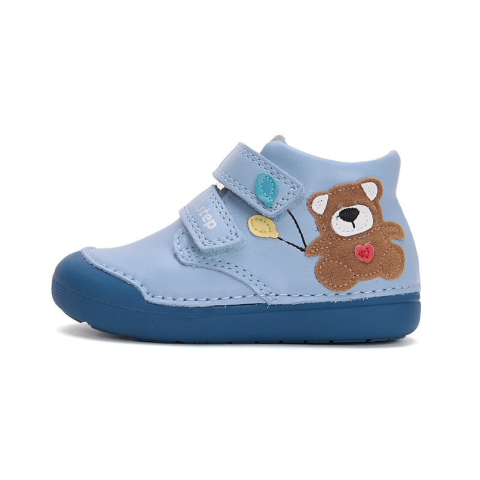 Világoskék-kék, macis, 2 tépőzáras, hajlékony talpú, nagy gumi orrú, bőr, DD Step kisfiú átmeneti cipő. Kivehető talpbetét.
