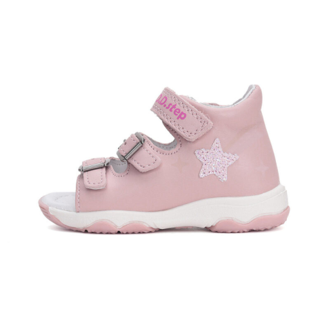 GYönyörű rózsaszín színű szandál , csillag mintával, amely napfény hatására változtatja a színét. Kívül-belül valódi bőrből készült, jól szellőzik, talpa rugalmas, csúszásmentes gumitalppal. Két csat egy tépőzáras így könnyen lábfejre igazítható. Kérge m