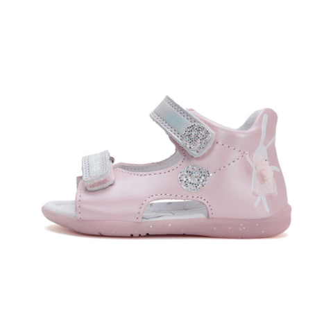 Tépőzárral záródó kislány szandál, amely tökéletesen alkalmas rendszeres utcai viseletre és alkalmi viseletre is egyaránt. Bőr felsőrész és talpbetét. Nem vízálló. Tisztítás: a szennyeződéseket a felsőrészen puha szőrű kefével, vagy nedves, puha ruhával t