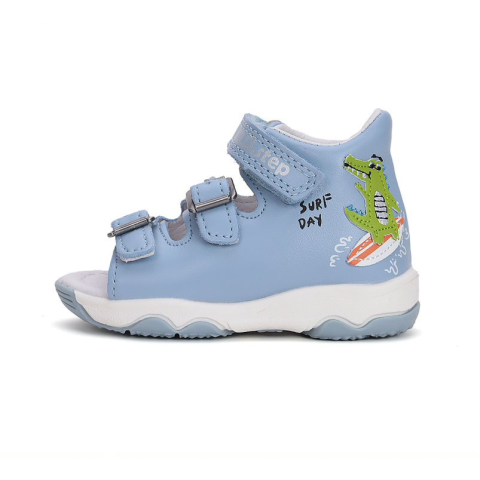 DD Step, kék, csatos és tépőzáras, krokodil mintás kisfiú szandál. Talpa hajlékony, lábszélességre állítható. Felsőrész: bőr. Tisztítás: a szennyeződéseket a felsőrészen puha szőrű kefével, vagy nedves, puha ruhával tisztítsa le, a talpat vizes lemosás