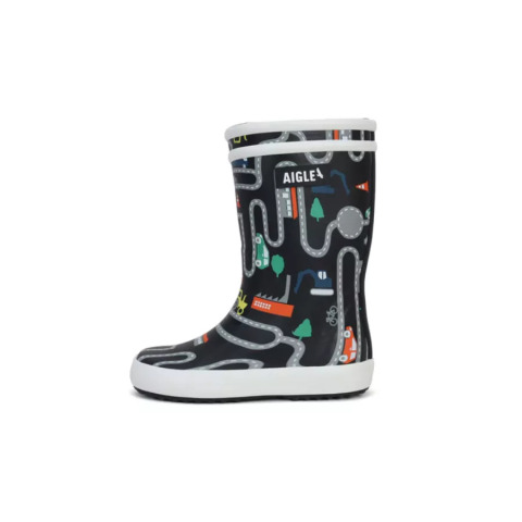 Az Aigle® gyerek gumicsizma kerek formájú cipőorral rendelkezik, amely kényelmes illeszkedést biztosít. A csizma sarokrésze lapos, ezáltal stabil tartást nyújt a lábaknak. A csizma felvétele könnyű és gyors, mivel belebújós kialakítással rendelkezik, így gyorsan felvehető a gyerekek számára. A cipő felső részén nyomott minta található, amely stílust és egyedi megjelenést kölcsönöz. Tulajdonságai közé tartozik, hogy vízhatlan, külső talpa rugalmas