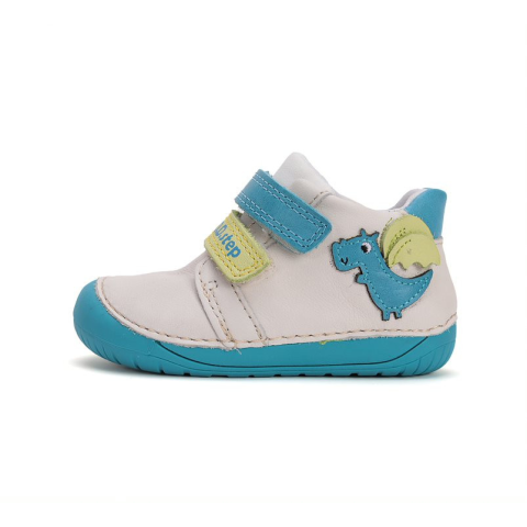 D.D.Step fiú barefoot cipő oldalán sárkány mintázattal, kettő tépőzárral. A barefoot cipőtalp igazodik a lábfej alakjához, érzésre is mintha mezítláb sétálna.