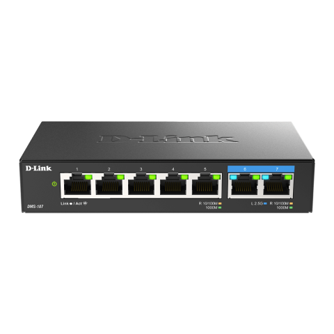 D-LINK Switch 5x1000Mbps + 2x2.5Gbps Multi-Gigabit Fémházas Asztali, DMS-107/E Type Unmanaged Number of ports 5 to 14 ports Main type of ports 1000BASE-T Gigabit Ethernet Type of