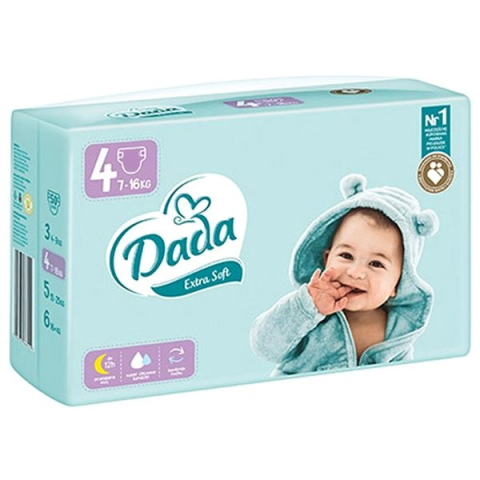 Eldobható pelenka - hagyományos pelenka, méret 4, gyermek súlya 7 - 16 kg, 82 darab a csomagban, ergonómikus abszorbens mag, rugalmas szalag és extra légáteresztő Gyermekednek szüksége van a szárazság érzésére, hogy elégedett legyen. A hagyományos kialakítású Dada eldobható pelenka nem fogja korlátozni a kisbabát és biztosítja neki a szükséges komfortot. A kíná