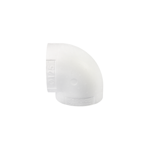 EPS polisztirol 90° könyök szigetelés DN 125 mmKét részből álló EPS polisztirol 90° könyök szigeteléséhez. EPS szigetelés anyagvastagsága 20 mm mely a hő szigetelés mellet alkalmas hangcsillapításra is.