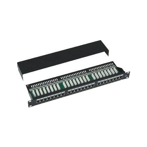 Patch panel - 19", Terminál típusú LSA / Krone Kész 19" patch panel 24 RJ-45 porttal nagy hálózatok építéséhez árnyékolt (STP) kábelekkel. A panel alkalmas foglalatba helyezéshez (rack), amely 1U helyet foglal, fekete színű, és támogatja