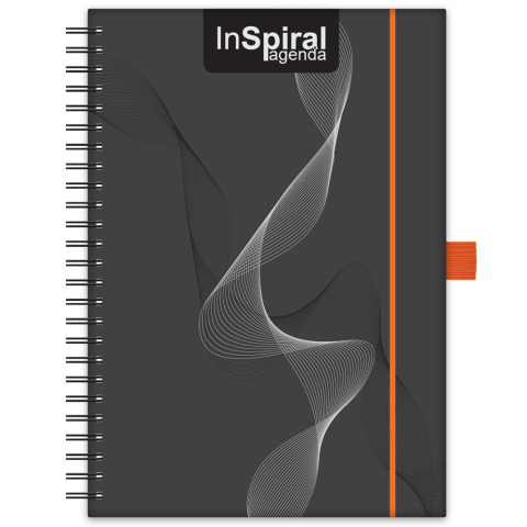Naptár, tervező, A5, heti, DAYLINER, InSpiral, fekete-narancs Finom tapintású Soft touch fóliával és UV formalakkal készült agendák, spirálos kivitelben. A tolltartó és az elasztikus zárószalag hasznos részei a terméknek. -időbeosztás: félórás, 8-20.0