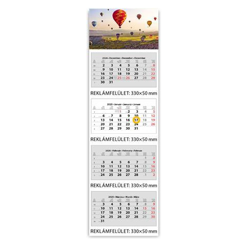 330x1100 mm lapok 70 g fehér ofszet papírból nyomás színe: szürke-vörös magyar-angol-német nyelvű naptárháló magyar ünnepek kiemelés nemzetközi ünnepek jelölése (45 ország) reklámfelület anyaga triplex karton reklámfelület a tömbök között: 330x50 mmGyártó/első EU forgalmazó adatai: Krenn Kft H-1163 Budapest, Cziráki u. 26-32. web@krennnaptar.hu www.krennaptar.hu
