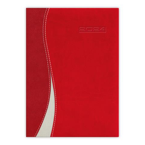 Naptár, tervező, A5, napi, DAYLINER Dubai, piros-piros A Dubai agendák puha, bőrhatású anyagból egyedi varásssal készülnek. A színek és formák valamint a stílusos vászonbetétek együtt alkotnak derűs összehangot. -időbeosztás: félórás, 8-20.00 h -műbőr